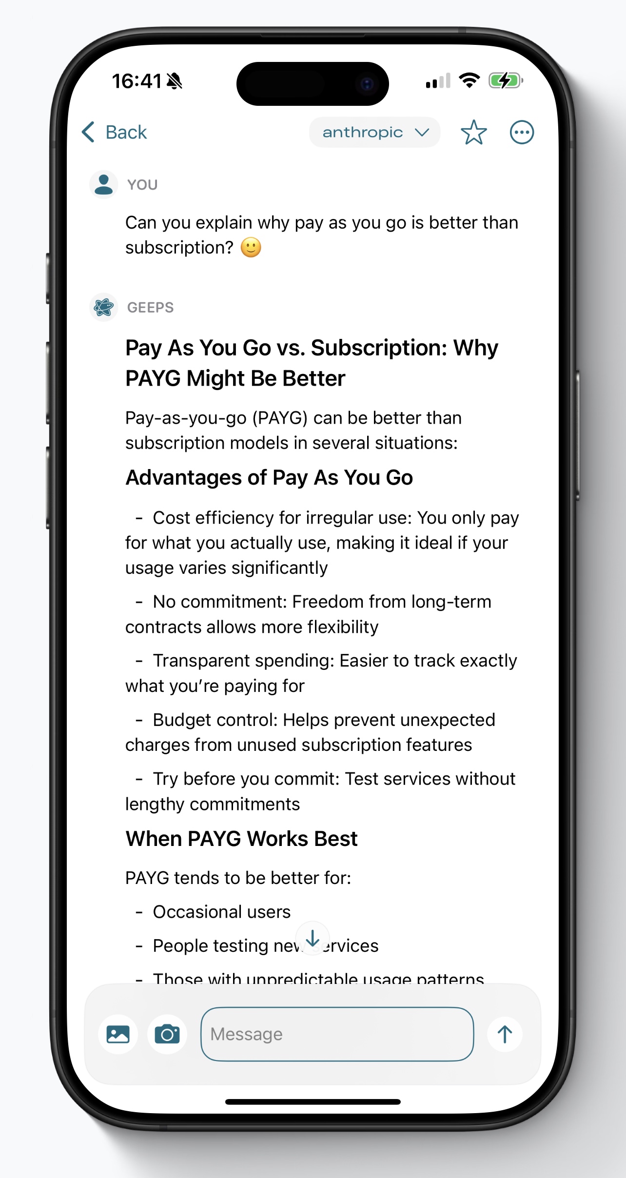 Geeps offers a familiar chat app experience with a more flexible pay-as-you-go setup. Gain access to new models faster and cheaper, using the tools you need without paying for multiple subscriptions - all in a single app. Manage your billing directly in your provider dashboards.