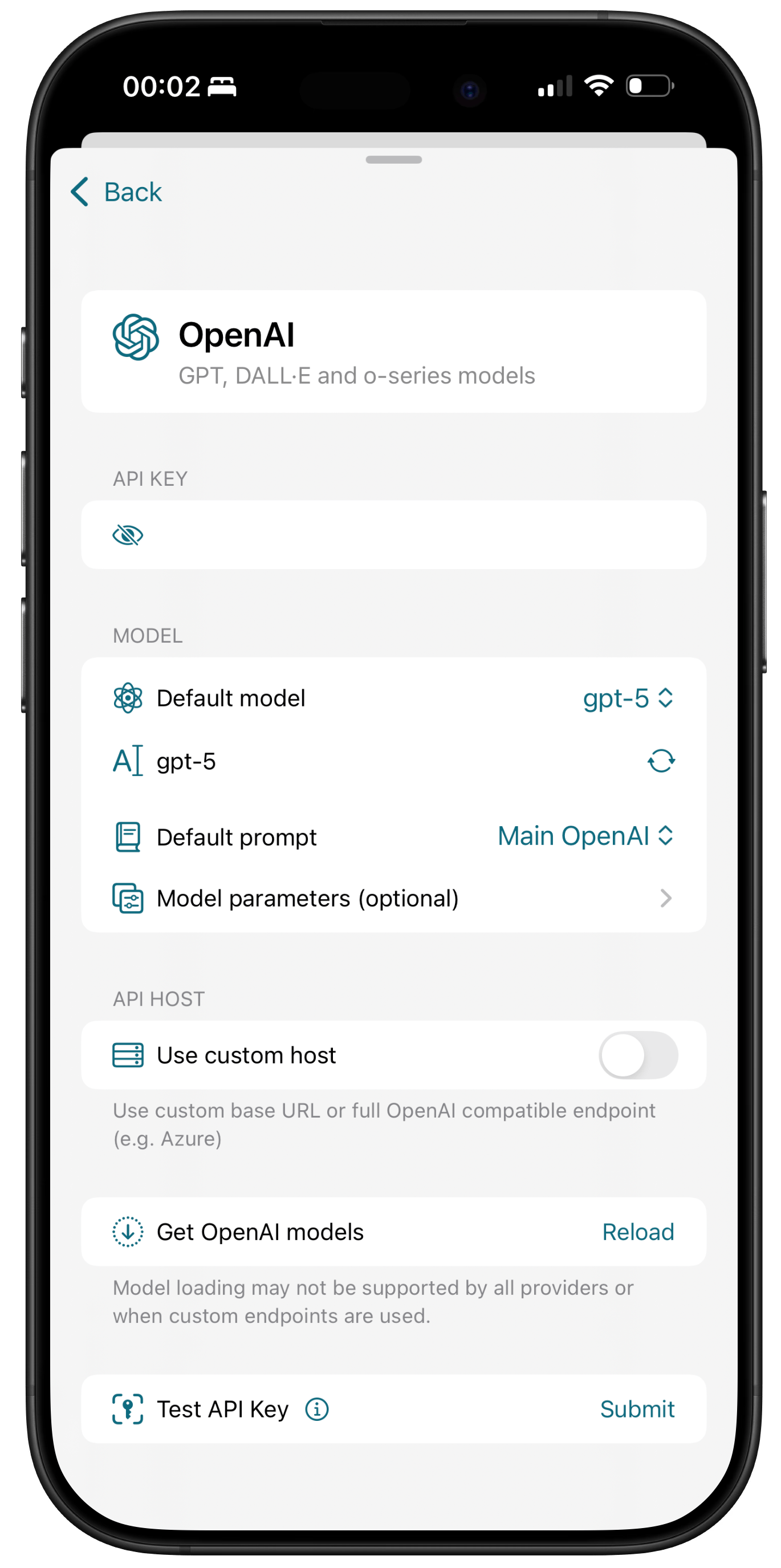 On iOS hit the gear icon to open Settings, go to API Settings and enter your API key(s) for OpenAI and other providers.